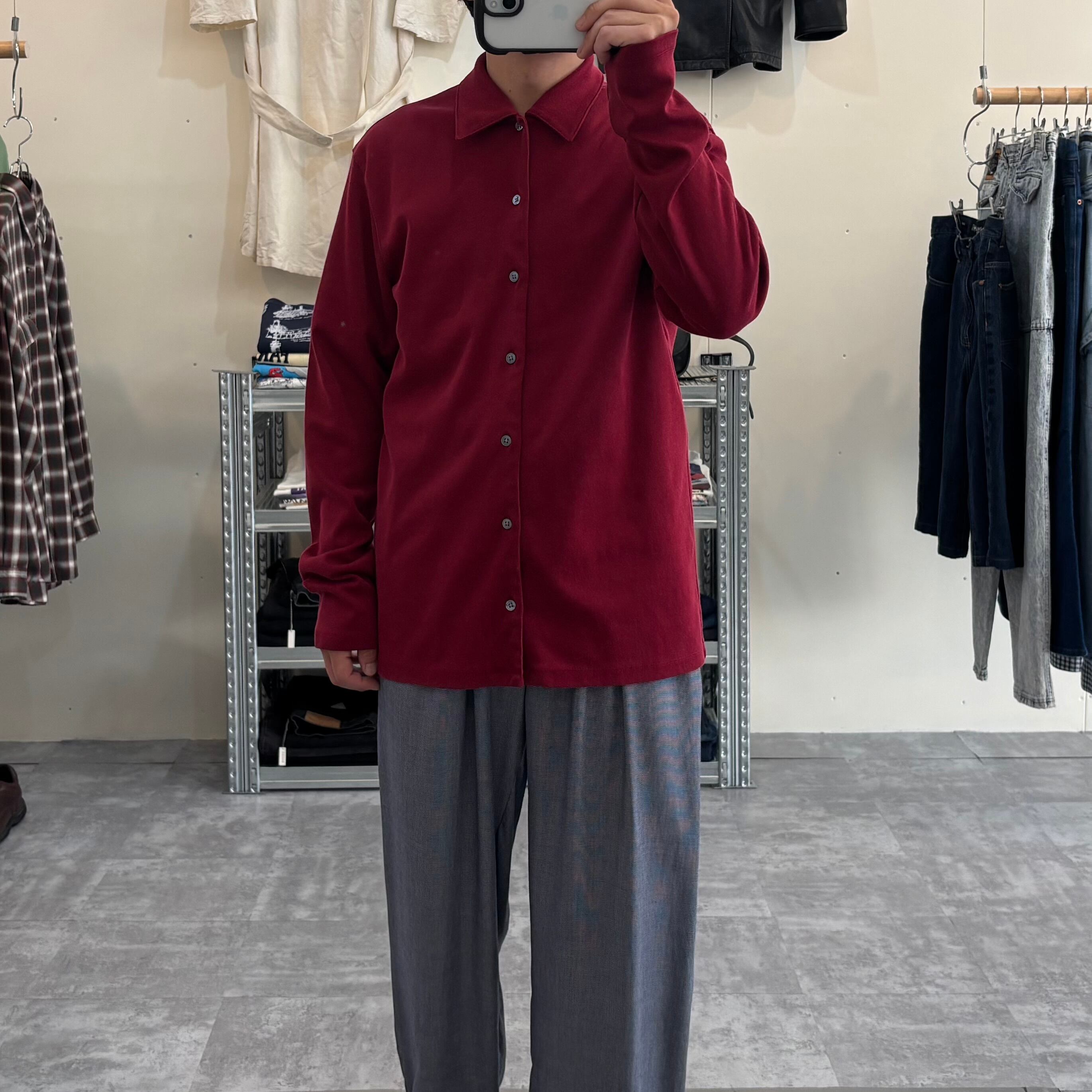 こちらは深みのある赤が目を惹く無地シャツ